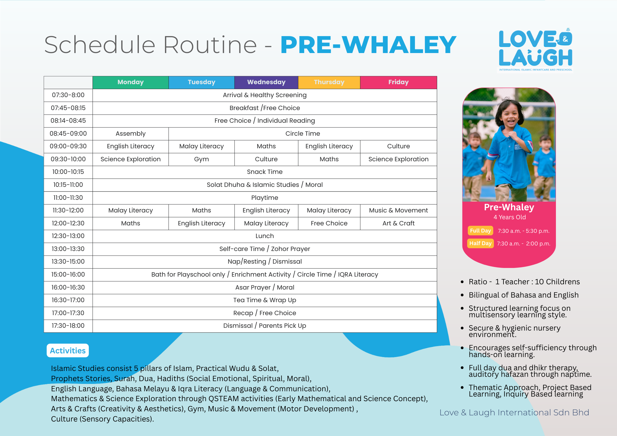 We accept the children start from 2 – 17 months (Infant), 18 – 24 months (Playhouse), 25 – 36 months (Playschool), 4 Years Old (Pre-Whaley), 5 Years Old (Junior Whaley), and 6 Years Old (Senior Whaley).