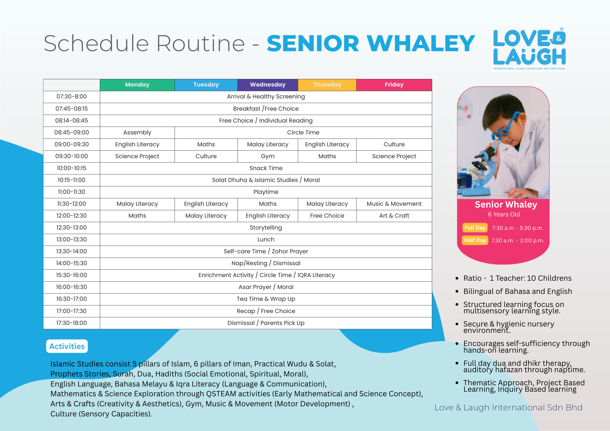 We accept the children start from 2 – 17 months (Infant), 18 – 24 months (Playhouse), 25 – 36 months (Playschool), 4 Years Old (Pre-Whaley), 5 Years Old (Junior Whaley), and 6 Years Old (Senior Whaley).